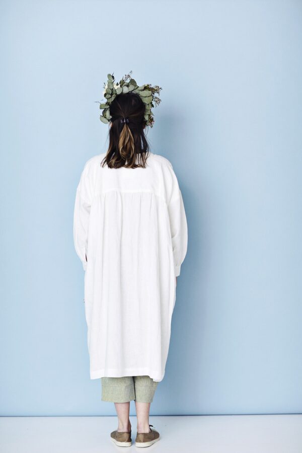 En pige i en hvid kjole. V-hals med bølgekant smale regulerbare skulderbånd søm med blondebånd i. En knelang kjole i vevd bomulls- og viskoseblandet kvalitet med engelsk blonde.